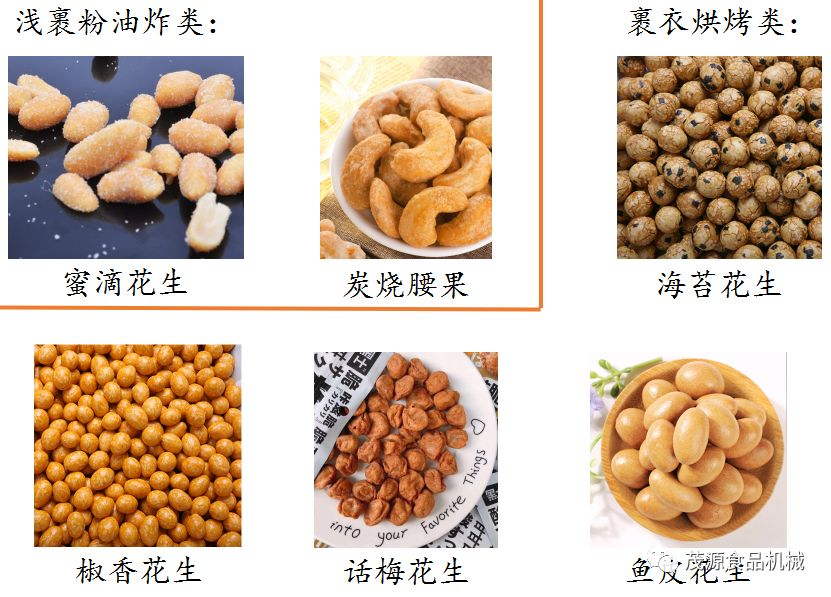 簡易型:原料→裹衣→烘烤→拌料→烘干→冷卻→包裝