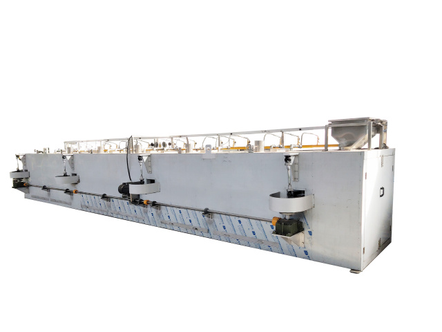 全自動平面回轉(zhuǎn)烤爐主要用于堅果炒貨及籽類產(chǎn)品裹衣裹粉后的烘烤加工。采用直燃式加熱方式,熱量直接作用于食品上,烘烤香味更濃郁,并通過設(shè)備的搖擺避免食品粘連變形。具有烘烤口味色澤優(yōu)良, 沒有污染等特點。